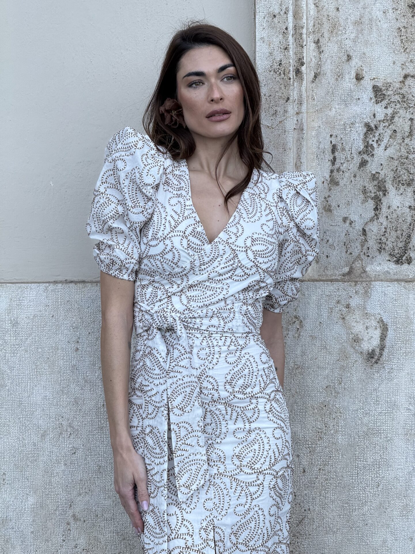 Destacamos su falda tubo de cintura alta y top multi posición con mangas farol.