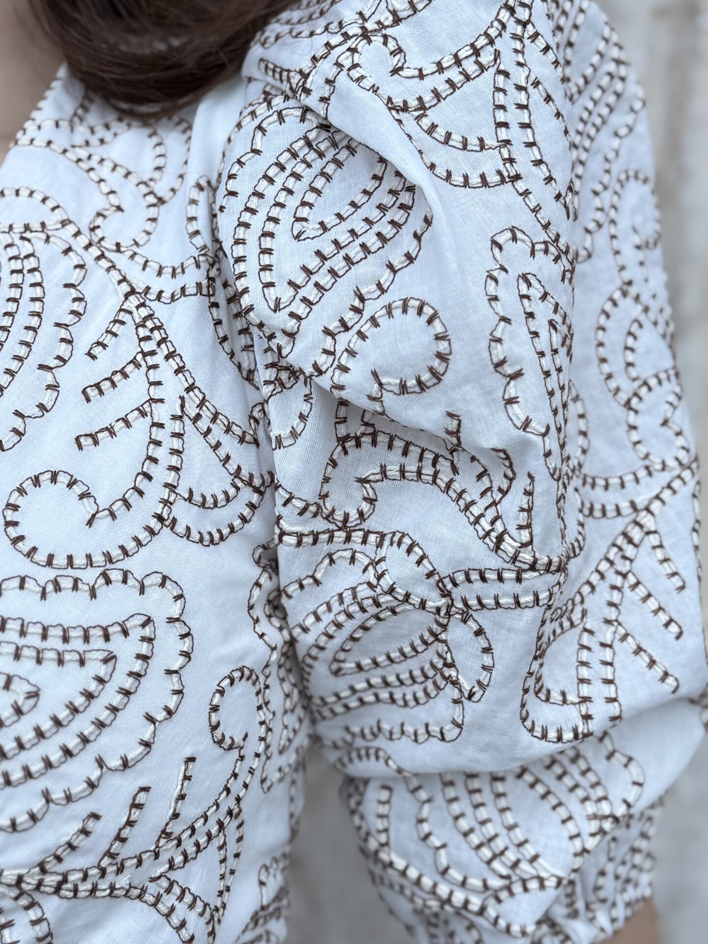 Nos encanta el detalle de dibujo bordado con hilo marrón haciendo contraste.