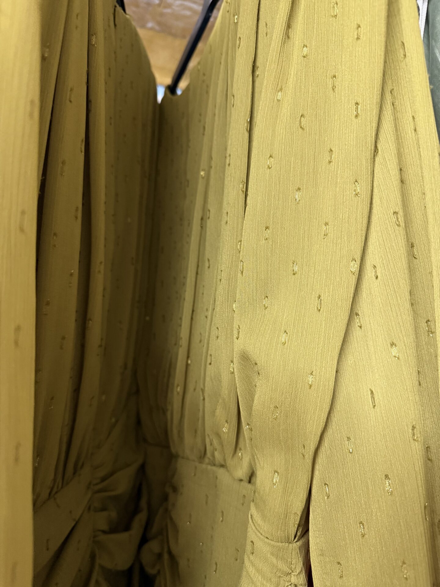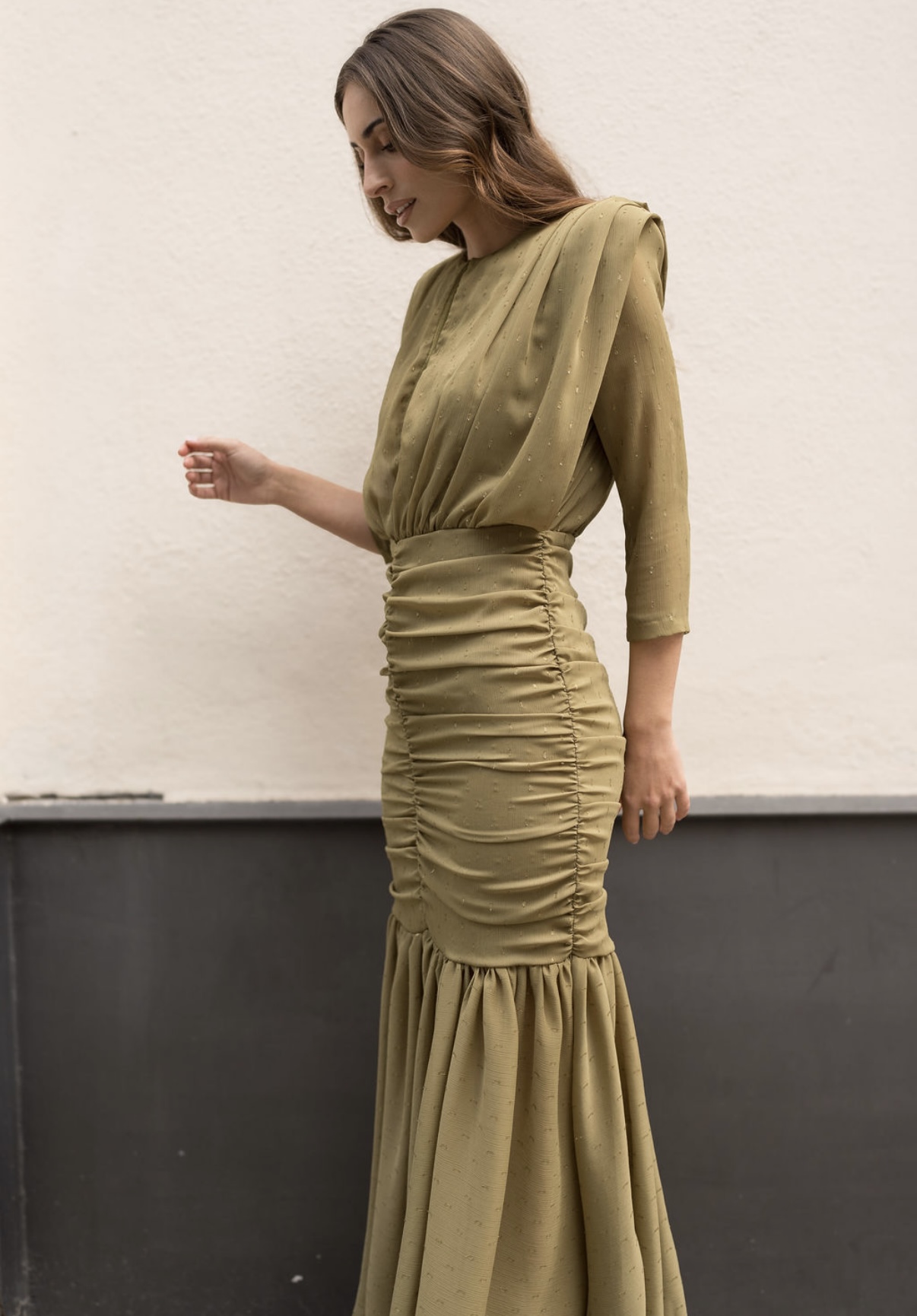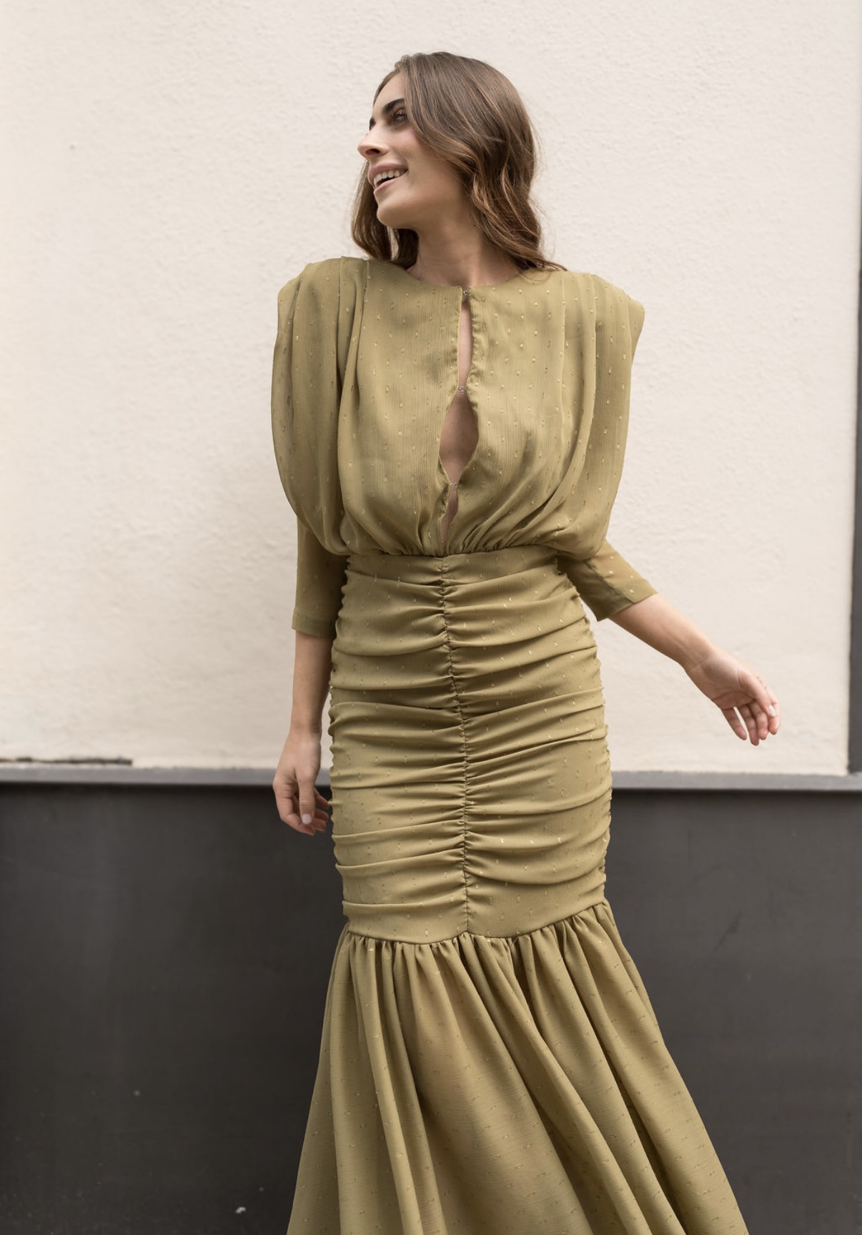 Vestido confeccionado en gasa con detalle de lurex dorado, completamente forrado.