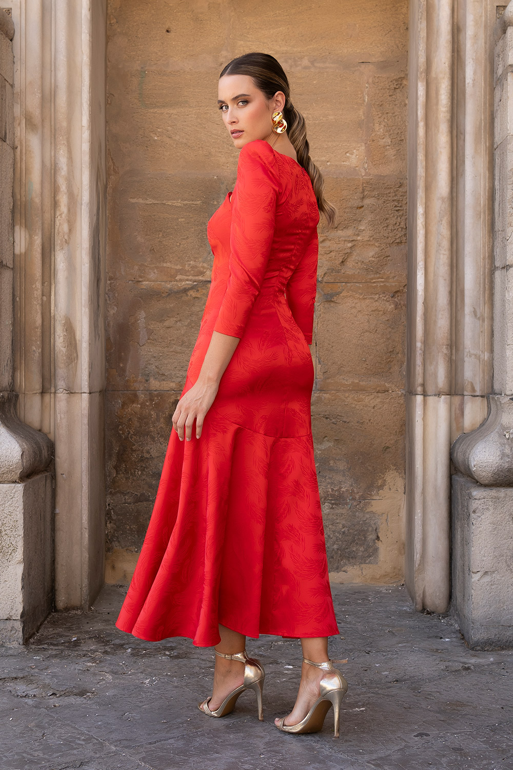 Vestido confeccionado en jacquard, completamente forrado.