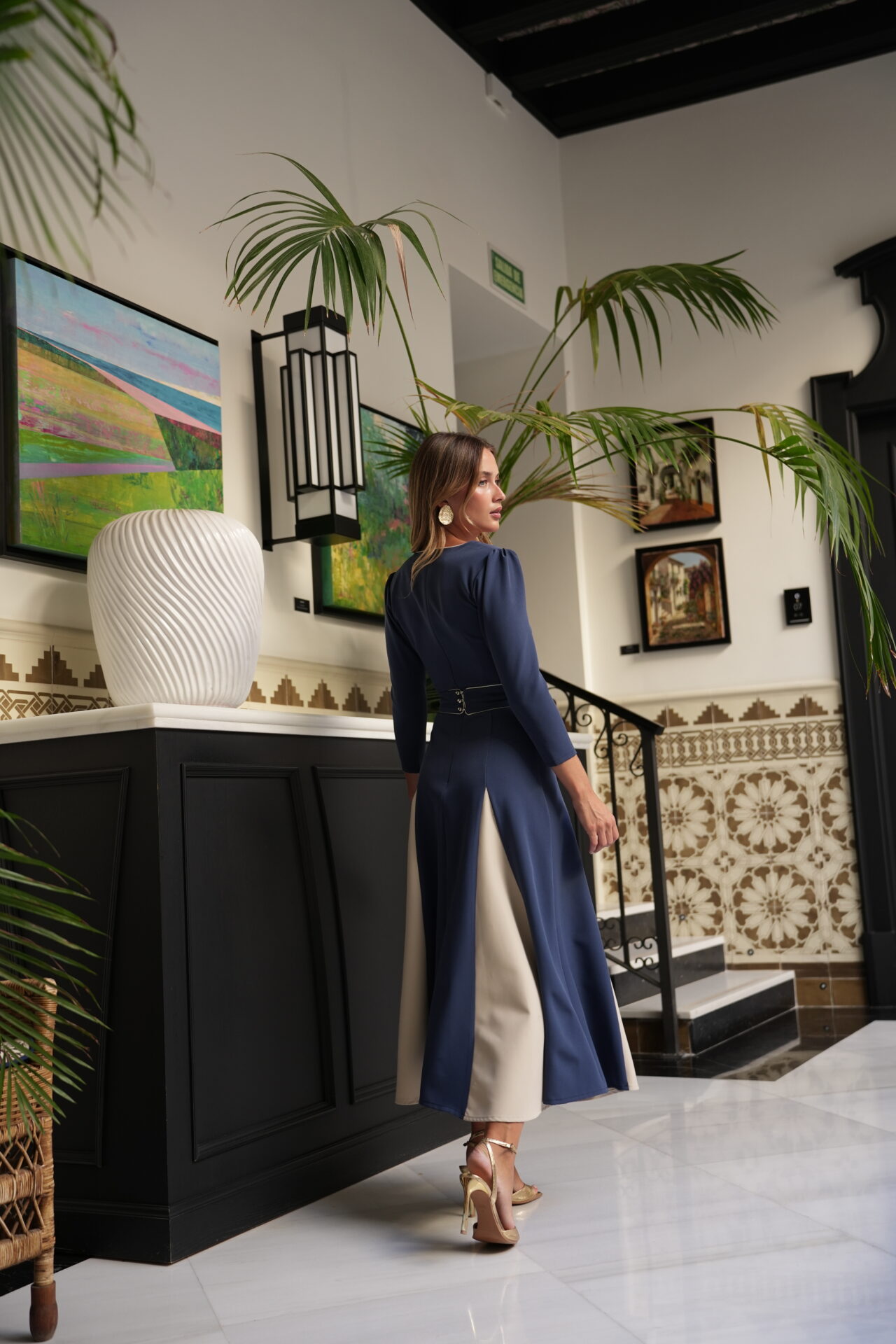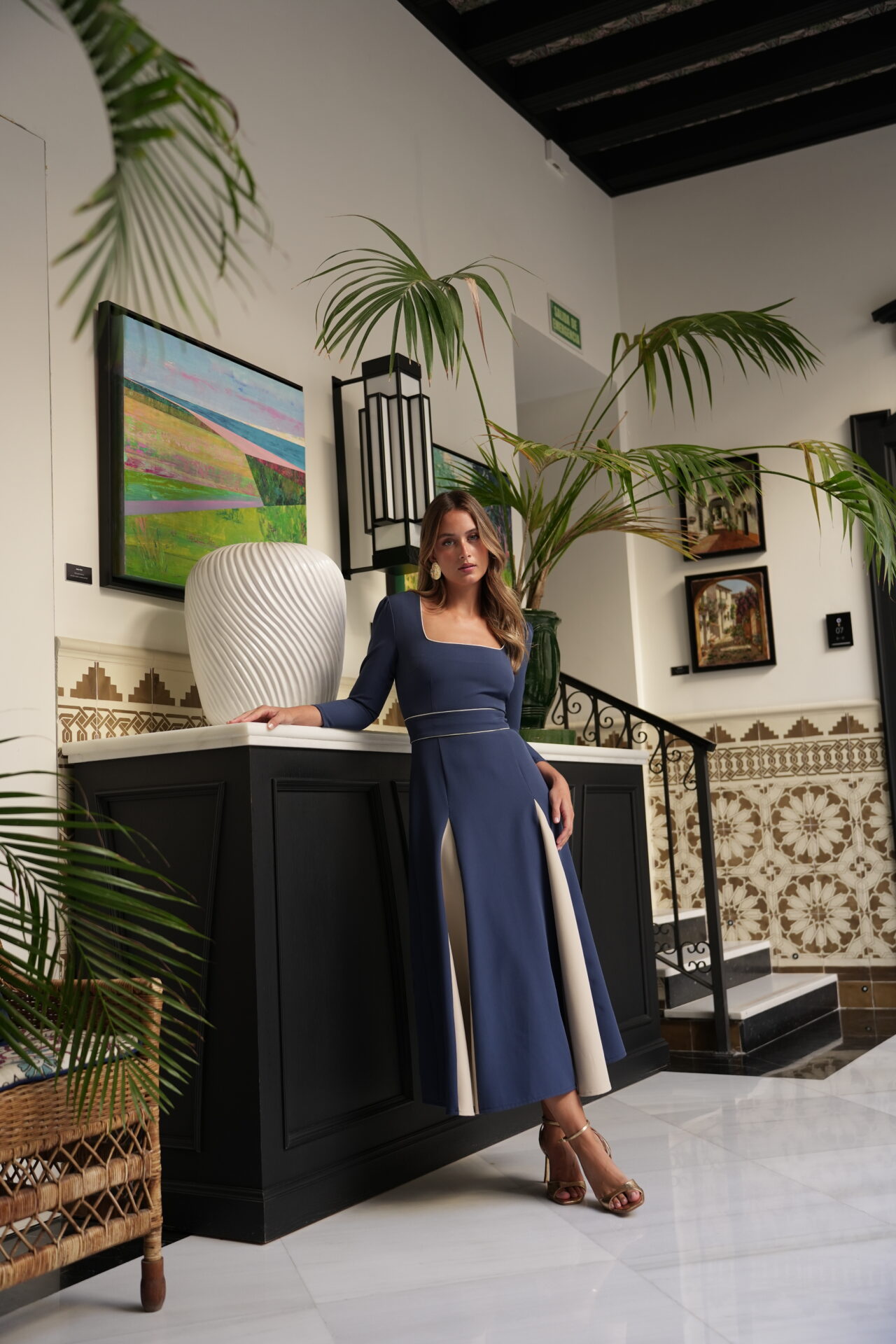 Destacamos su escote cuadrado, cintura marcada, falda de vuelo con godets y detalle de ribetes en contraste.
