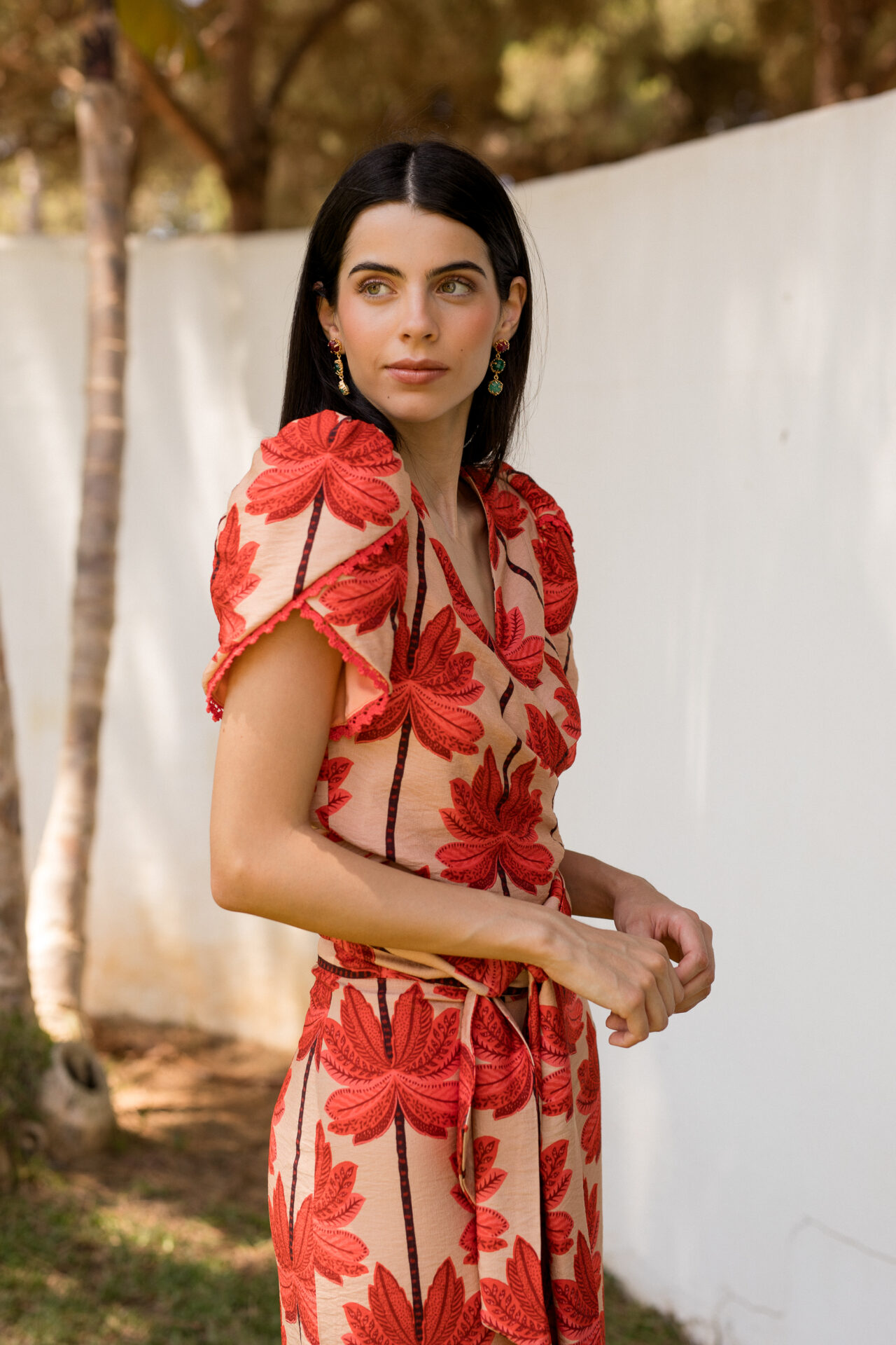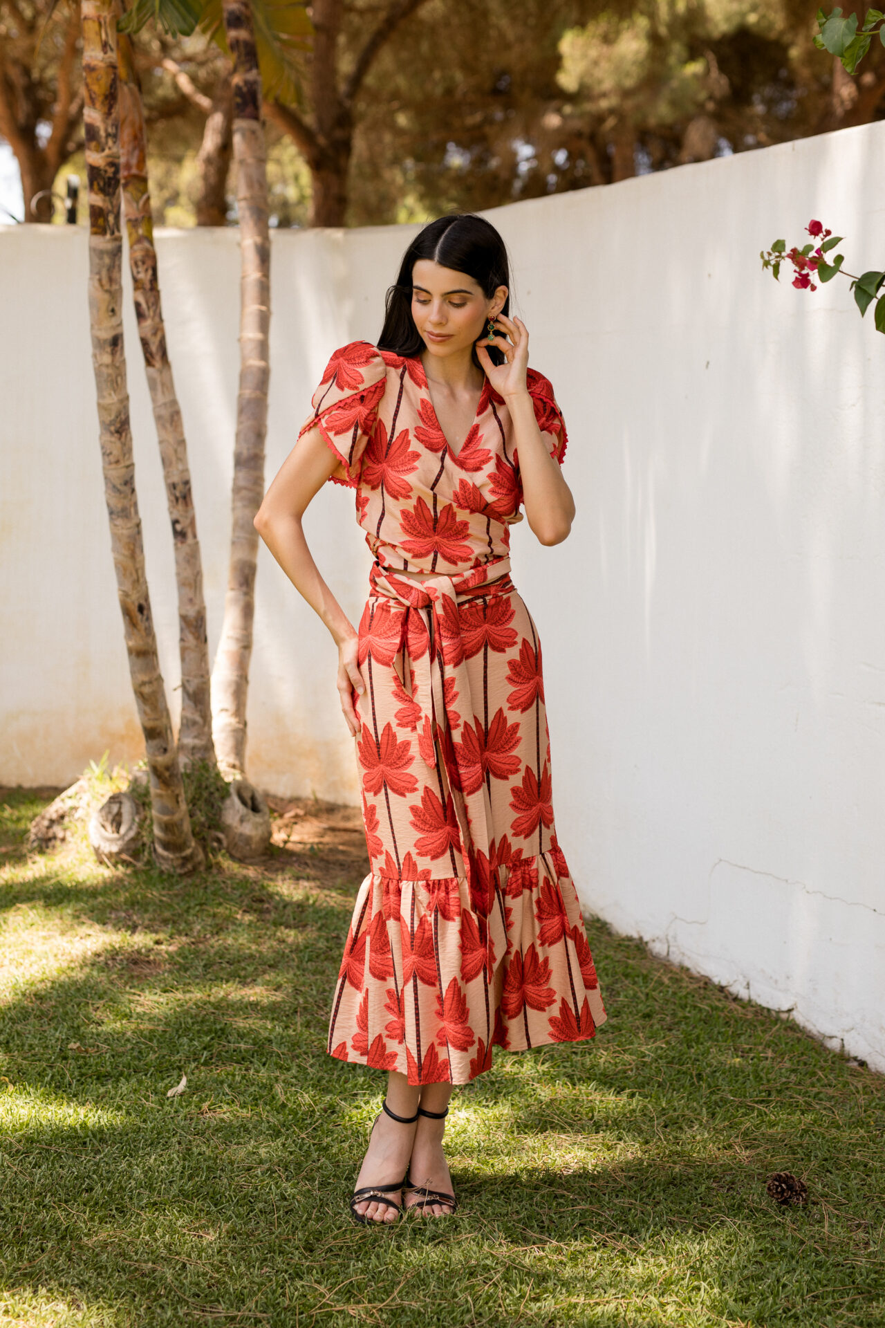 Destacamos su falda recta con volante y top multiposición, con mangas tulipán.