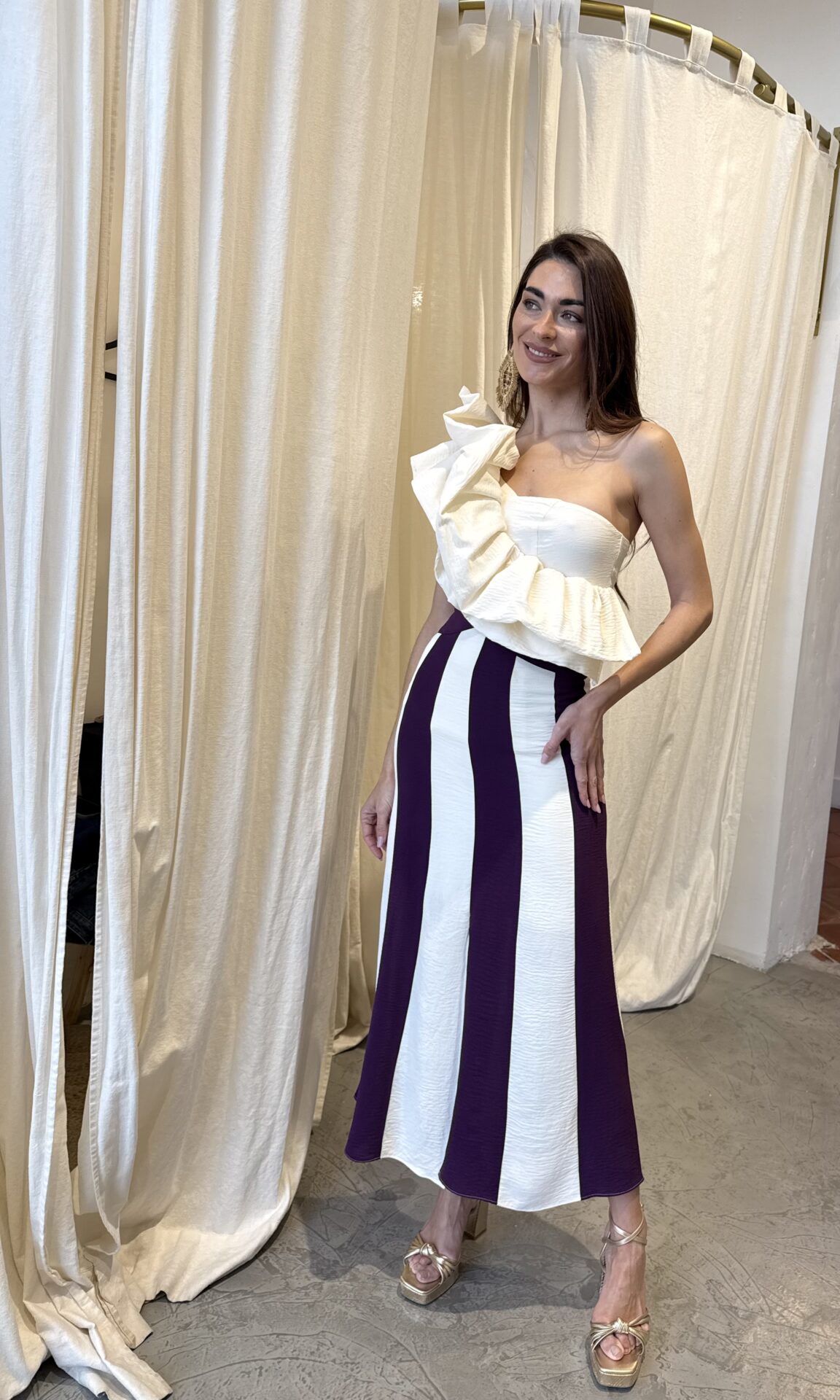 Destacamos su falda de cintura alta y corte evasé y su top asimétrico con maxi volante.