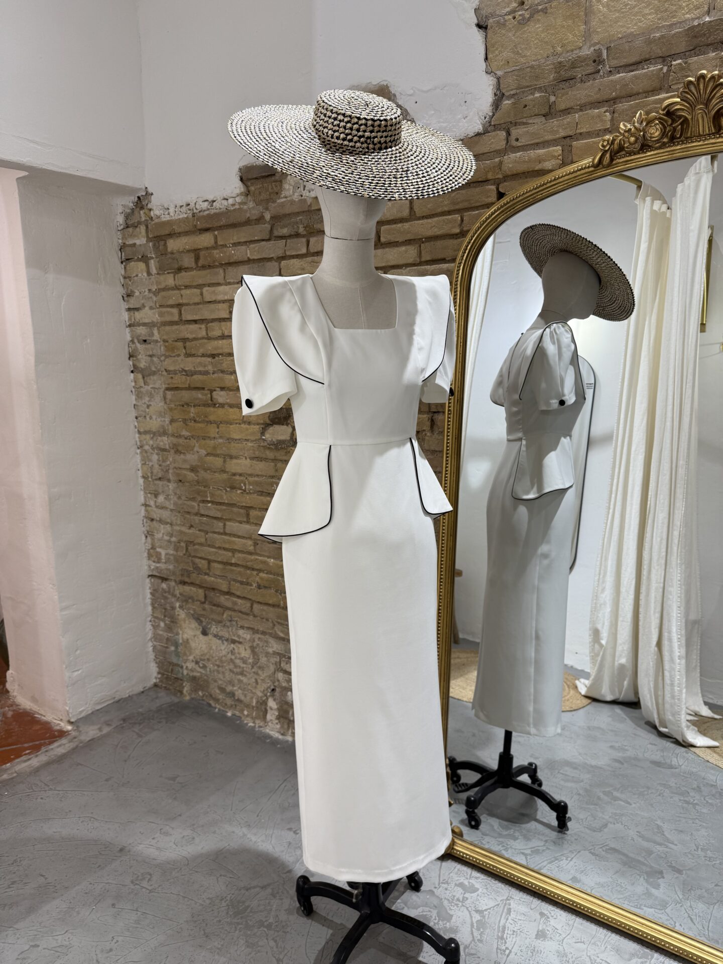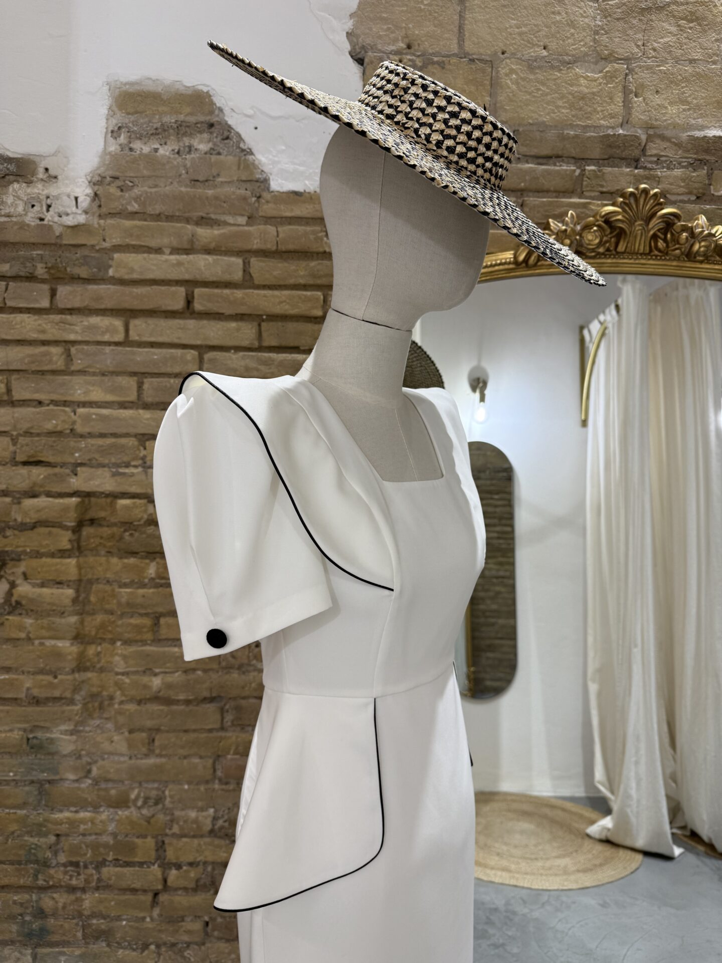 Destacamos su diseño con mangas abullonadas, detalle de peplum y ribetes negros a contraste.