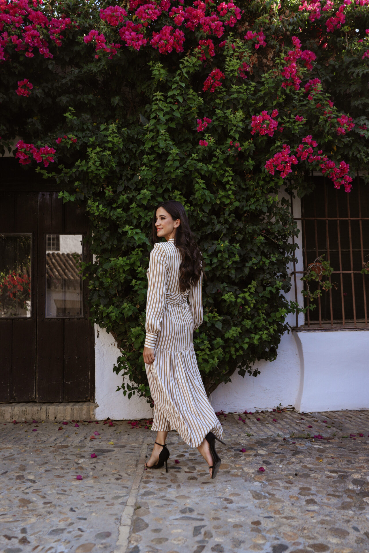 Destacamos sus mangas abullonadas, cintura marcada y falda fluida acabada en volante.