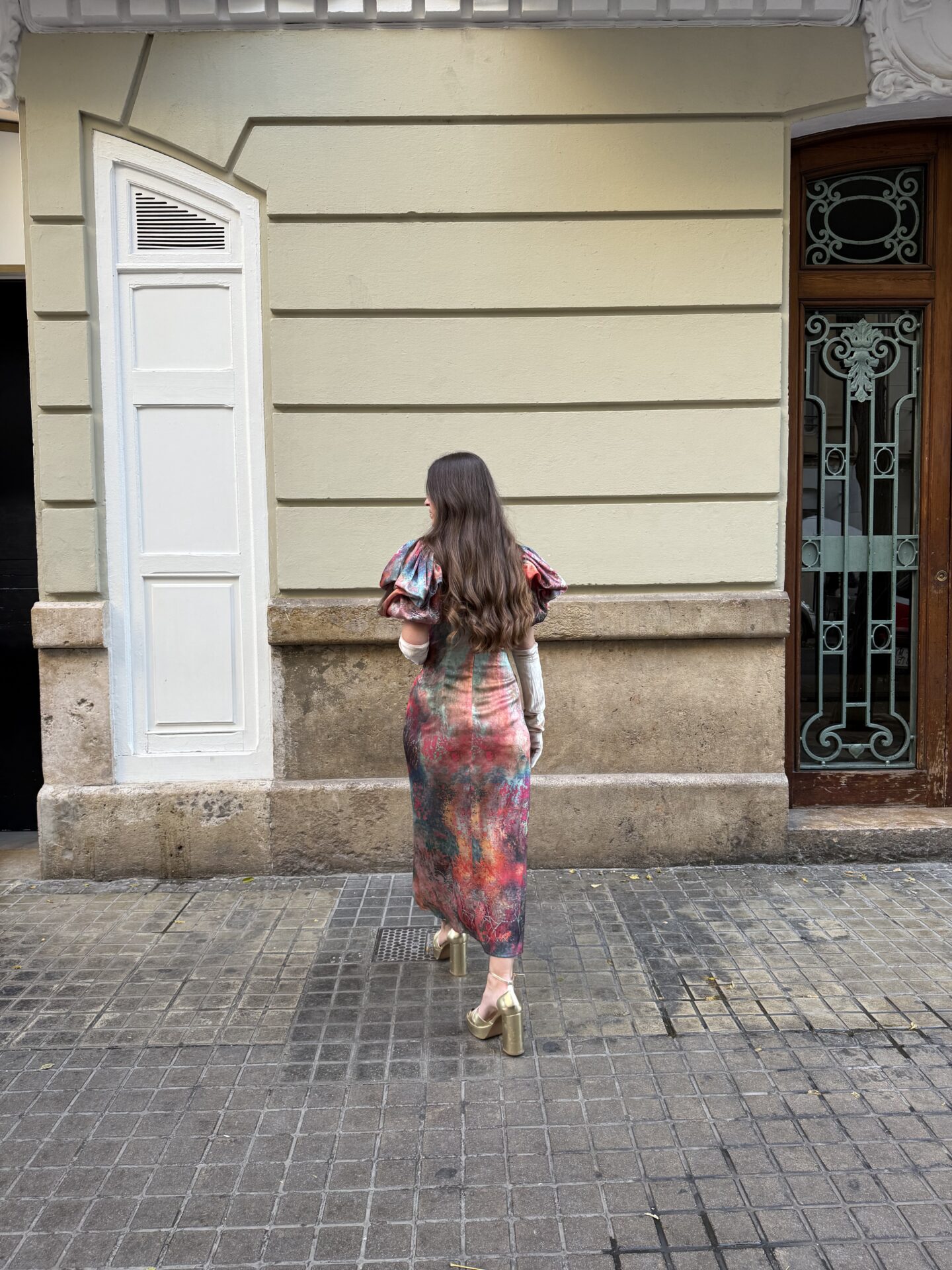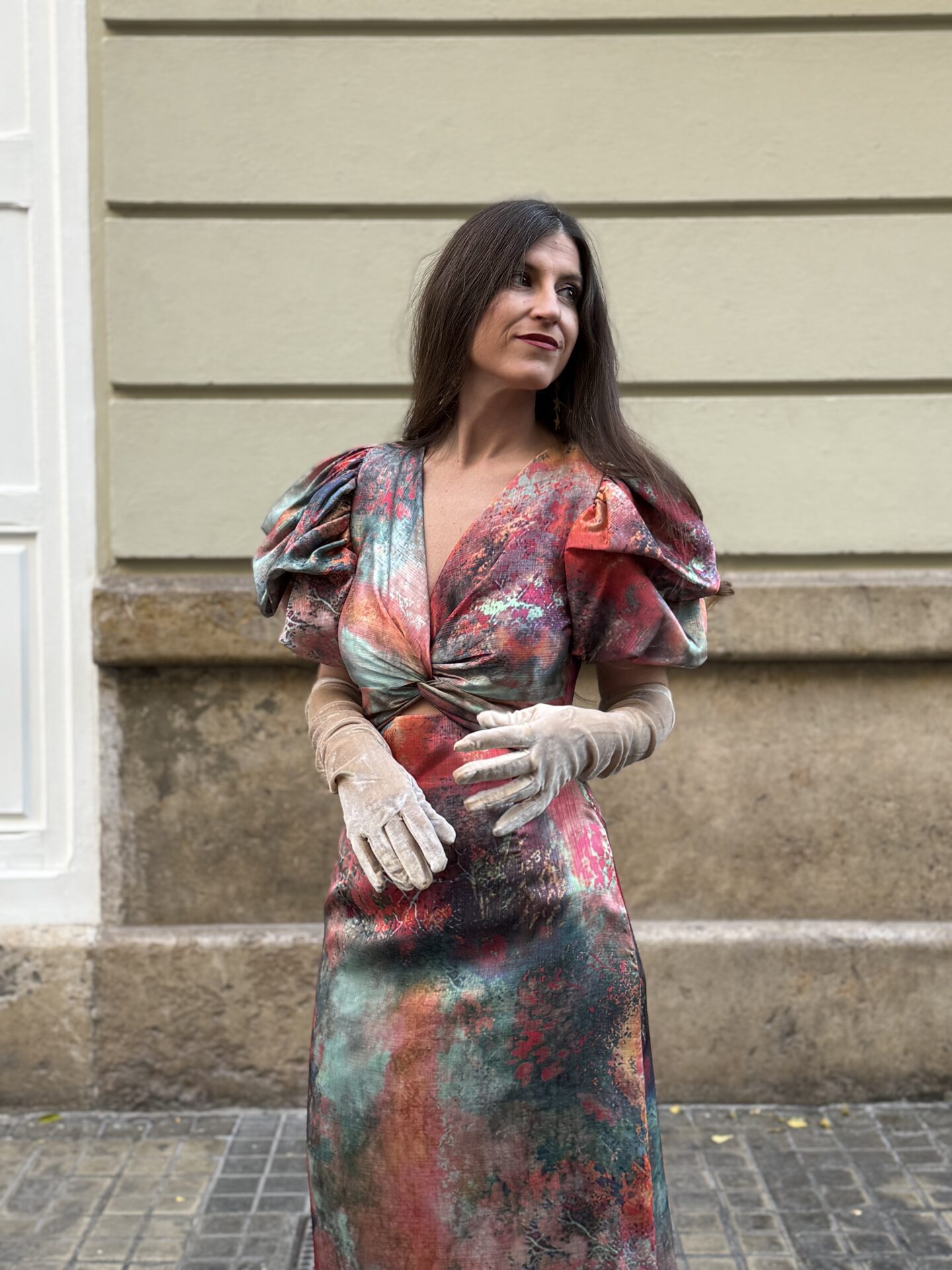 Destacamos sus mangas abullonadas, su detalle cut-out y su falda recta fluida.