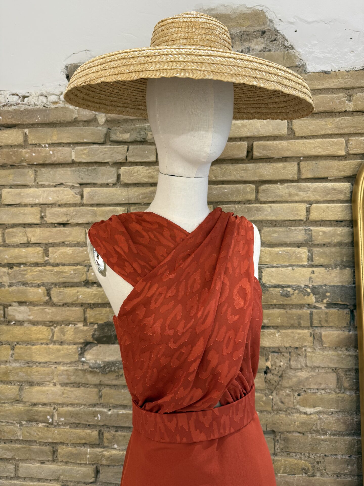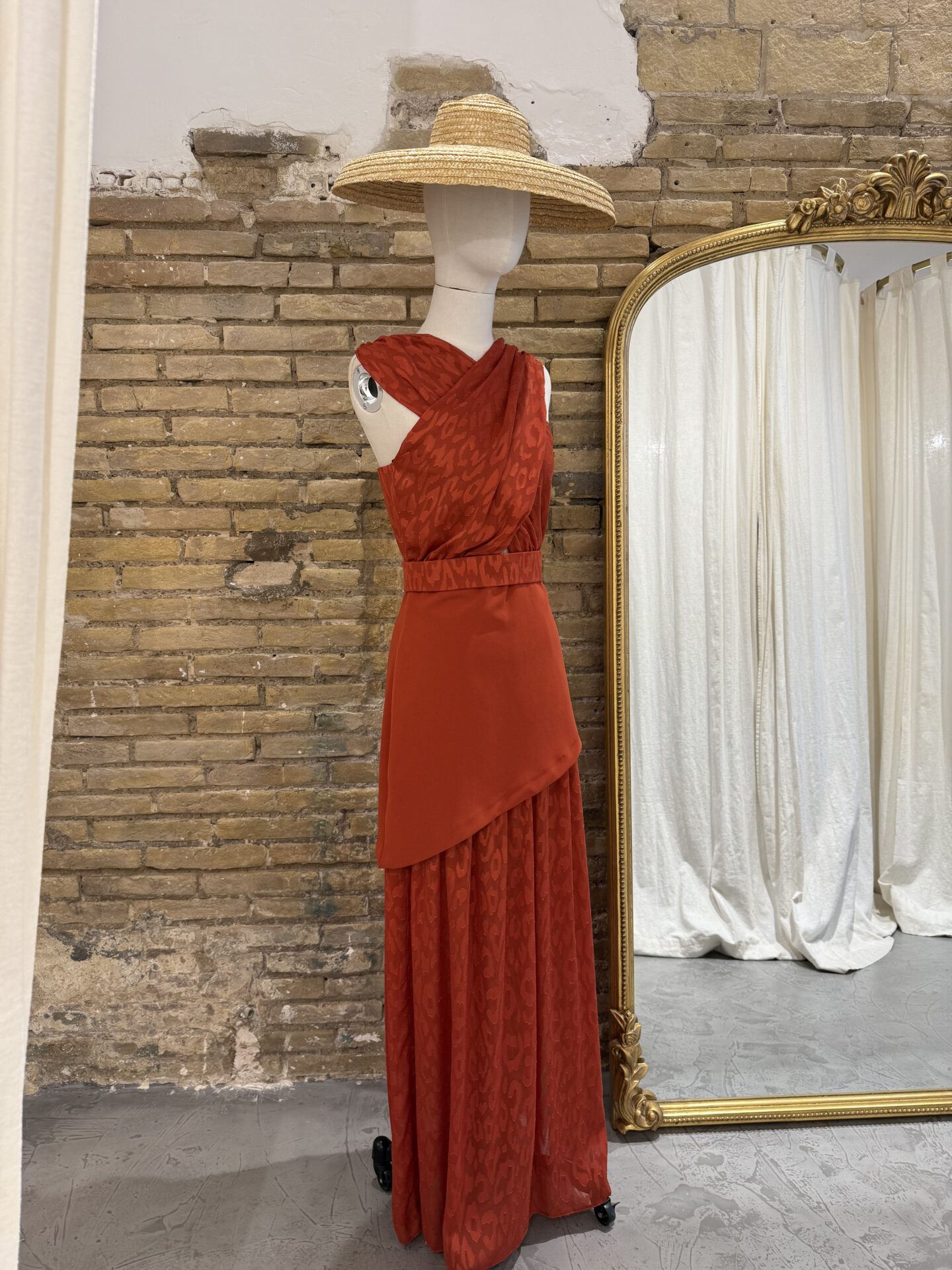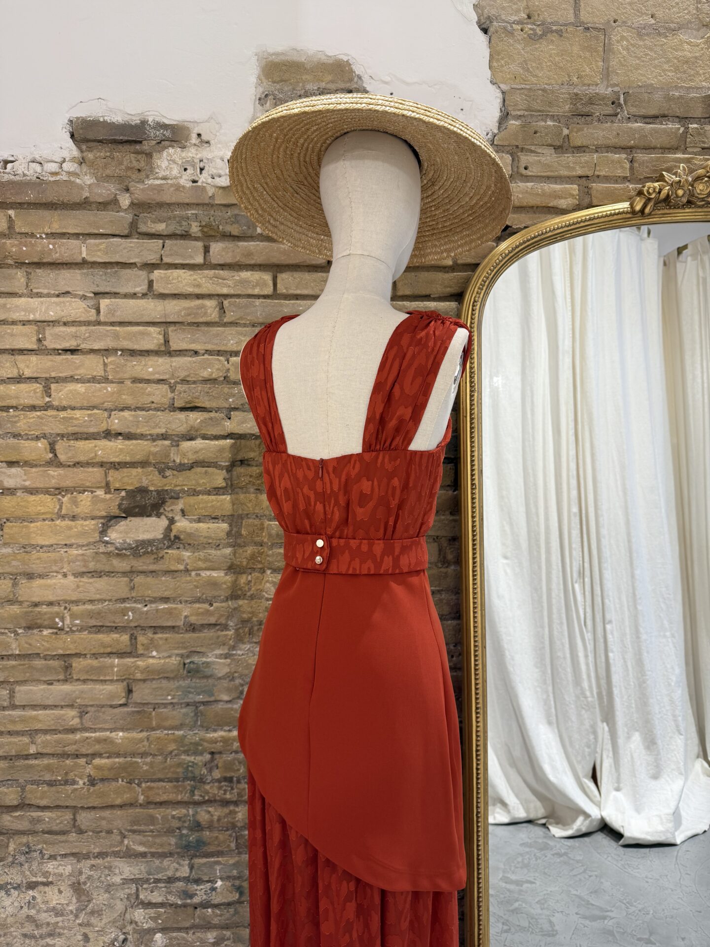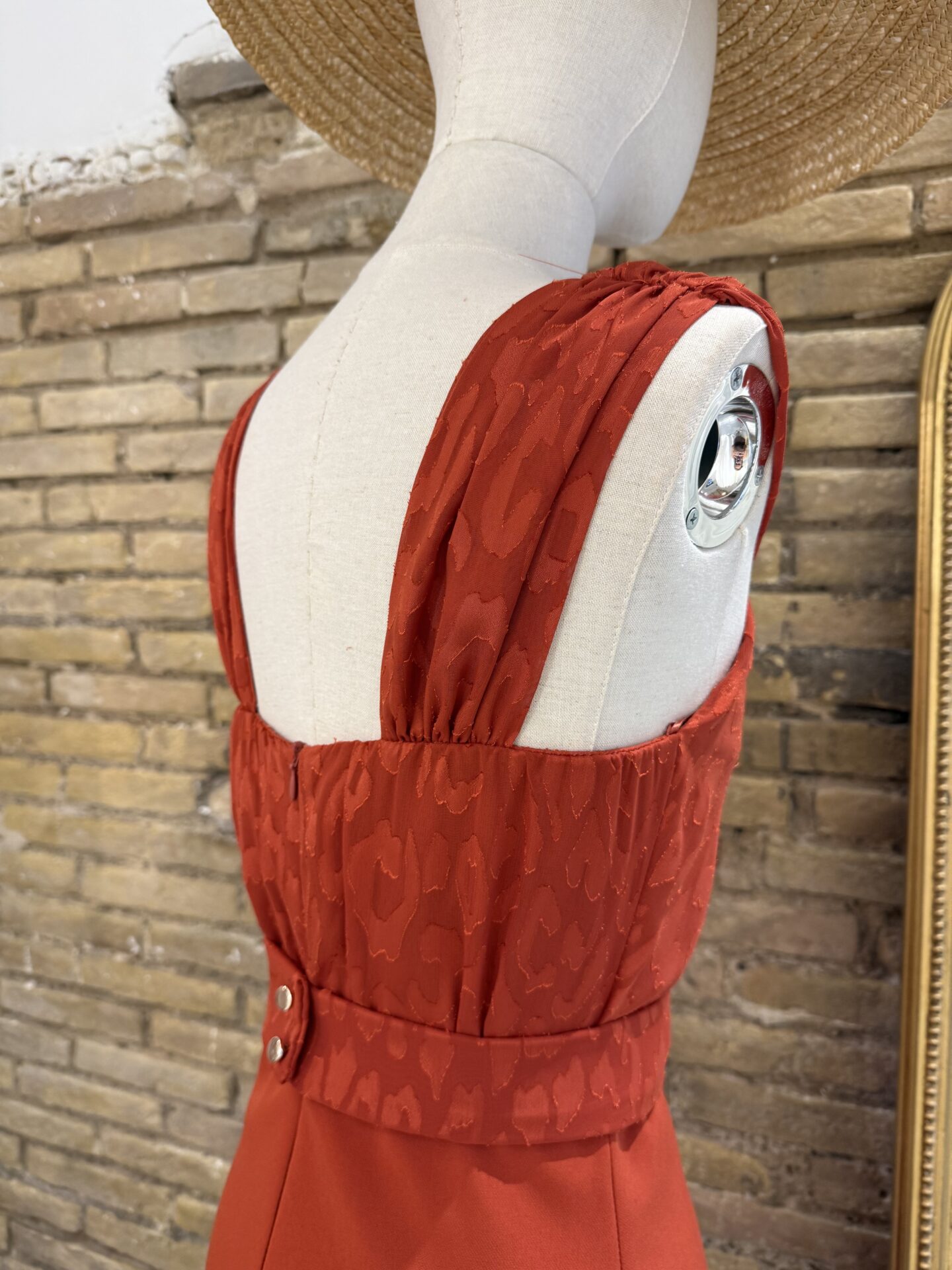 Vestido confeccionado en gasa y crepe con elastano, completamente forrado.