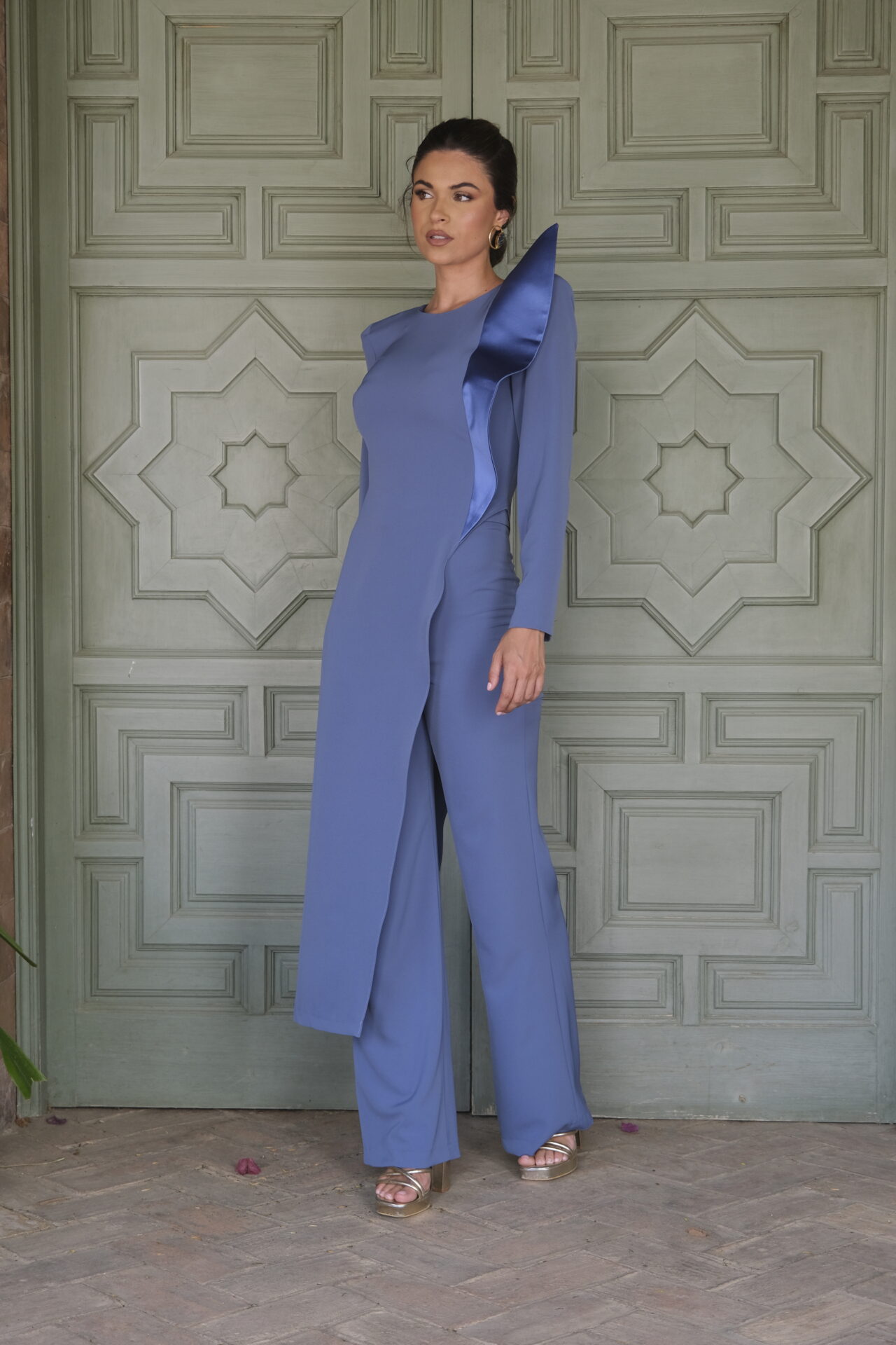 Destacamos su pantalón palazzo de cintura alta y cuerpo efecto capa con corte asimétrico.