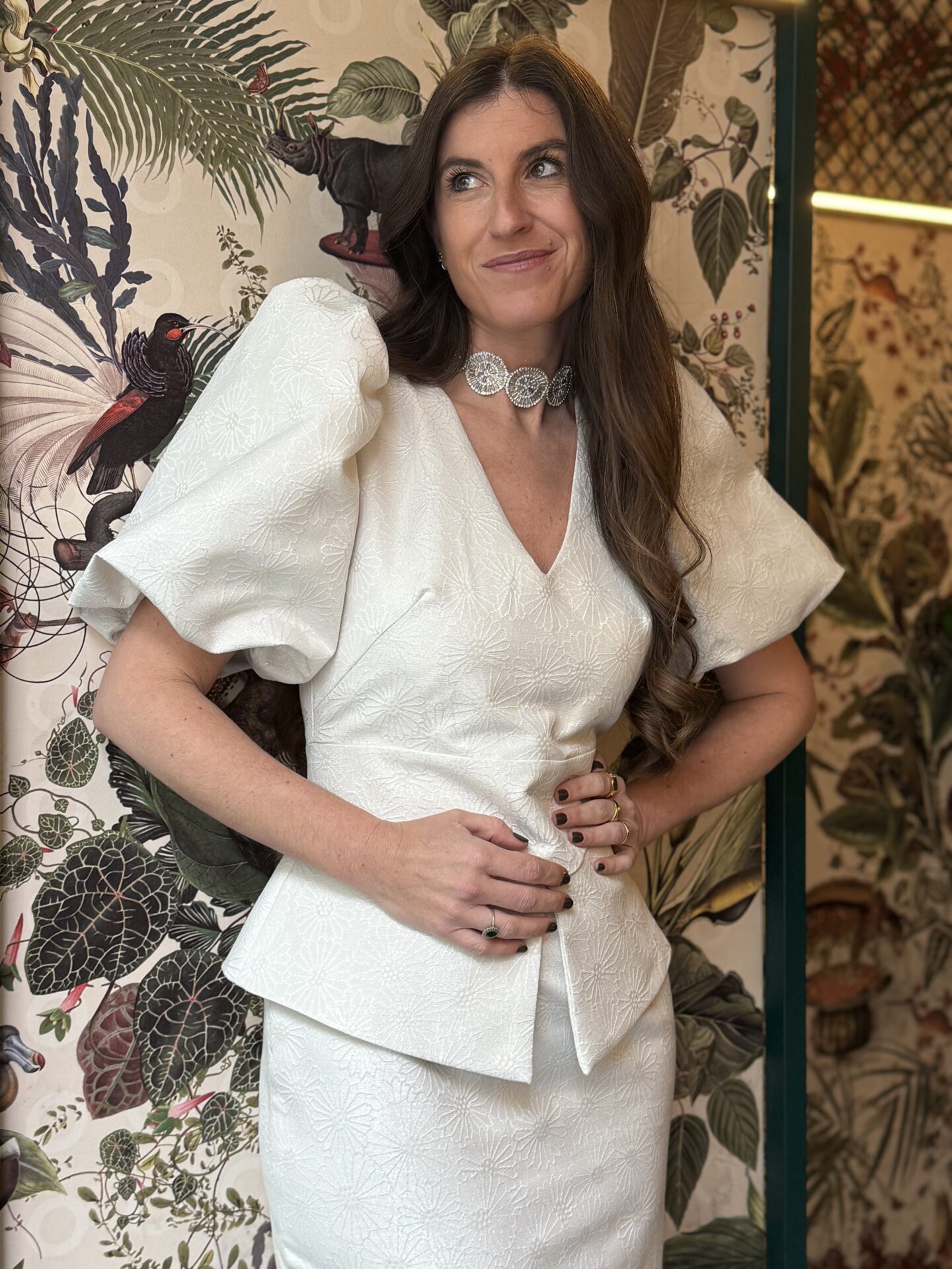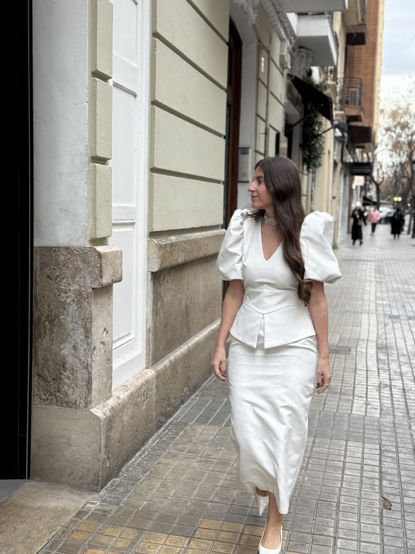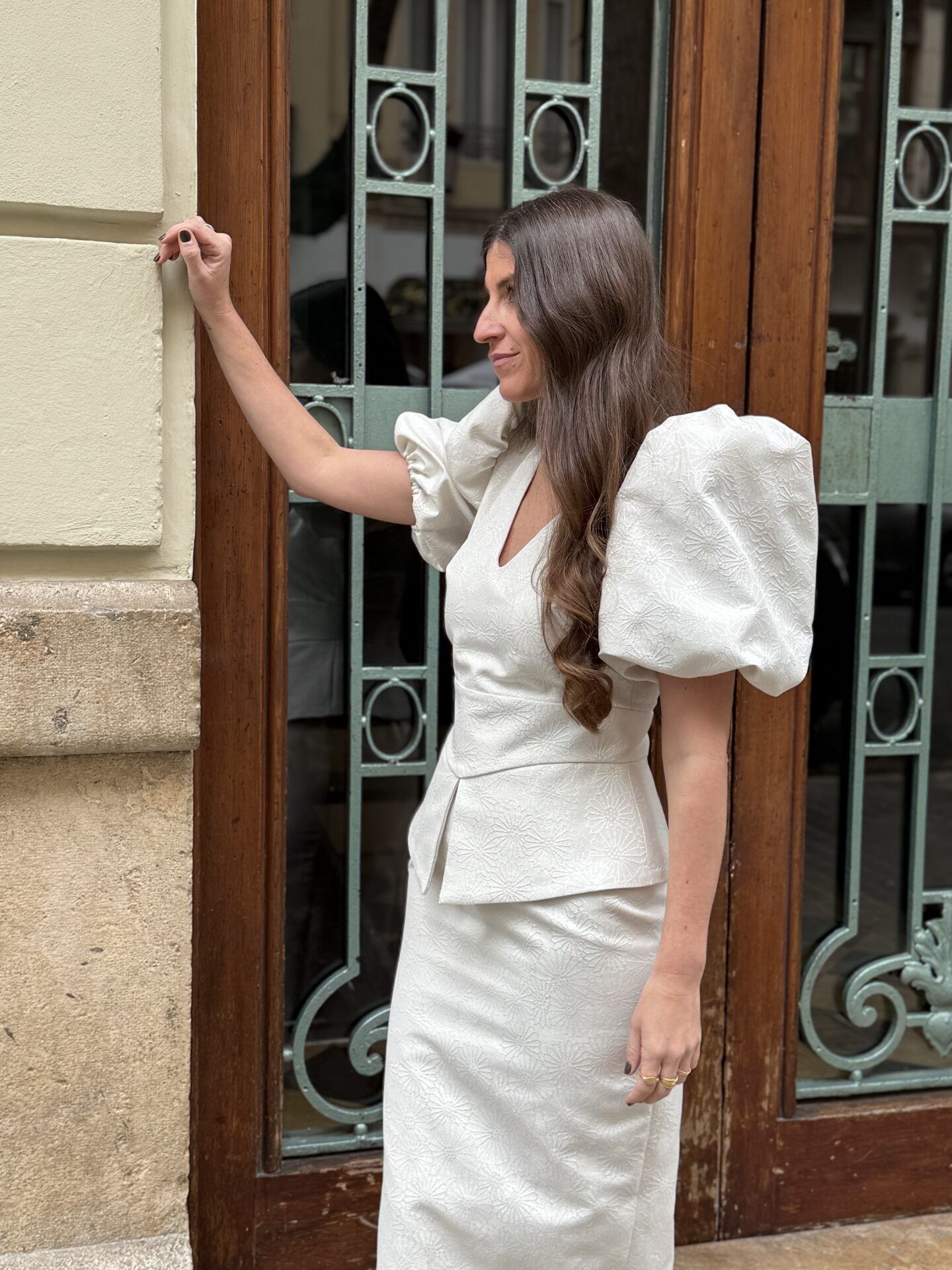 Destacamos sus maxi mangas abullonadas, escote V y falda tubo con peplum.